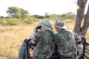 Leave at 2:30 pm for afternoon hunt. Go back to where we last saw Buffalo, check the dirt road to look for tracks to see if they left the area. They haven’t left so back into the thorny trees and brush to try and locate them.