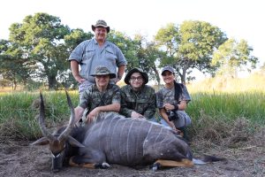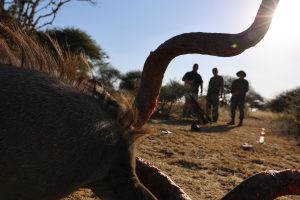 We go look for more buffalo elsewhere and come across two kudu bull. One’s very old with excellent horns. He’s on the downside, very old, no longer a breeding bull probably won’t last a year. He’s walking away and I tell PH Derian I’d like to take him. We get out and I’m on the sticks as he’s quartering walking away at 50 yards. I make the shot and he collapses after another 10-15 yards. He’s an exceptional very old bull. He’s 50 and 51” a nice old bull, I’m very pleased.